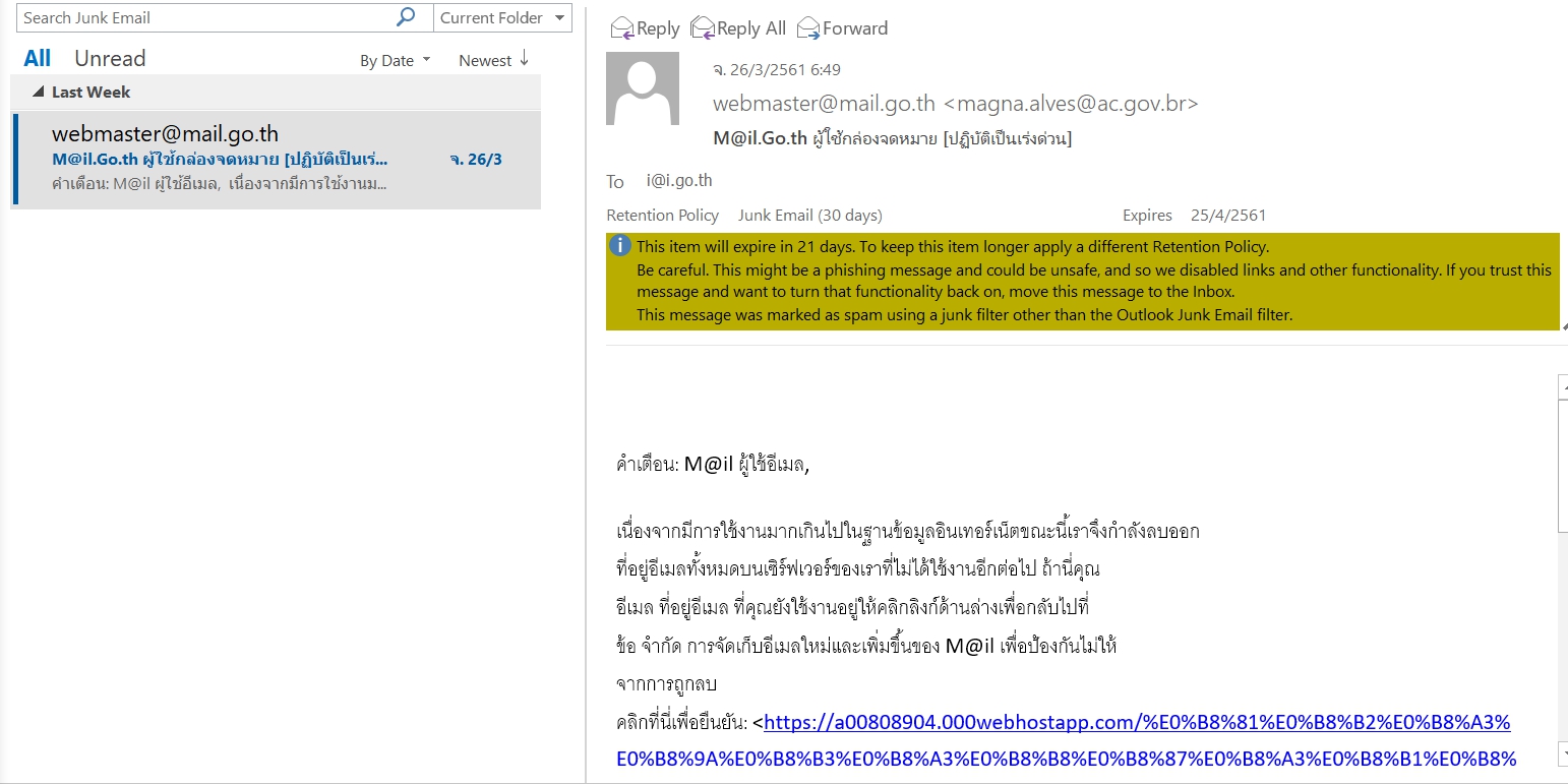 ขณะนี้พบเมล์หลอกลวงในลักษณะแจ้งว่าเมล์ของท่านมีปัญหา หรือ สามารถคลิกที่ link แล้วจะสามารถขยายพื้นที่เมล์ของท่านได้ ศูนย์เทคโนโลยีสารสนเทศขอเรียนว่าสำนักรัฐบาลอิเล็กทรอนิกส์ไม่มีนโยบายส่ง link เพื่อให้ท่านดำเนินการใดๆ ขอได้โปรดอย่าคลิก link ใดๆ เพื่อความปลอดภัยของอีเมล์ของท่านเอง หากท่านคลิกไปแล้วเมล์ของท่านอาจถูก hack และถูกบล็อคจาก สำนักรัฐบาลอิเล็กทรอนิกส์ เมล์ดังกล่าวมีหน้าจอดังภาพที่แนบมาพร้อมนี้ ซึ่งมีการปลอมแปลงอีเมล์คล้ายเมล์ของระบบ รวมถึงปลอมแปลง source code ให้อุปกรณ์ป้องกัน spam mail ของสำนักรัฐบาลอิเล็กทรอนิกส์ตรวจจับไม่ได้ หากพบเห็นเมล์ลักษณะดังกล่าว โปรดอย่าคลิก link ที่แนบมา และหากไม่แน่ใจหรือมีปัญหาการใช้งานโปรดสอบถามศูนย์เทคโนโลยีสารสนเทศ โทร. 99425/ 98323/ 99461 หรือสำนักงานรัฐบาลอิเล็กทรอนิกส์โดยตรง