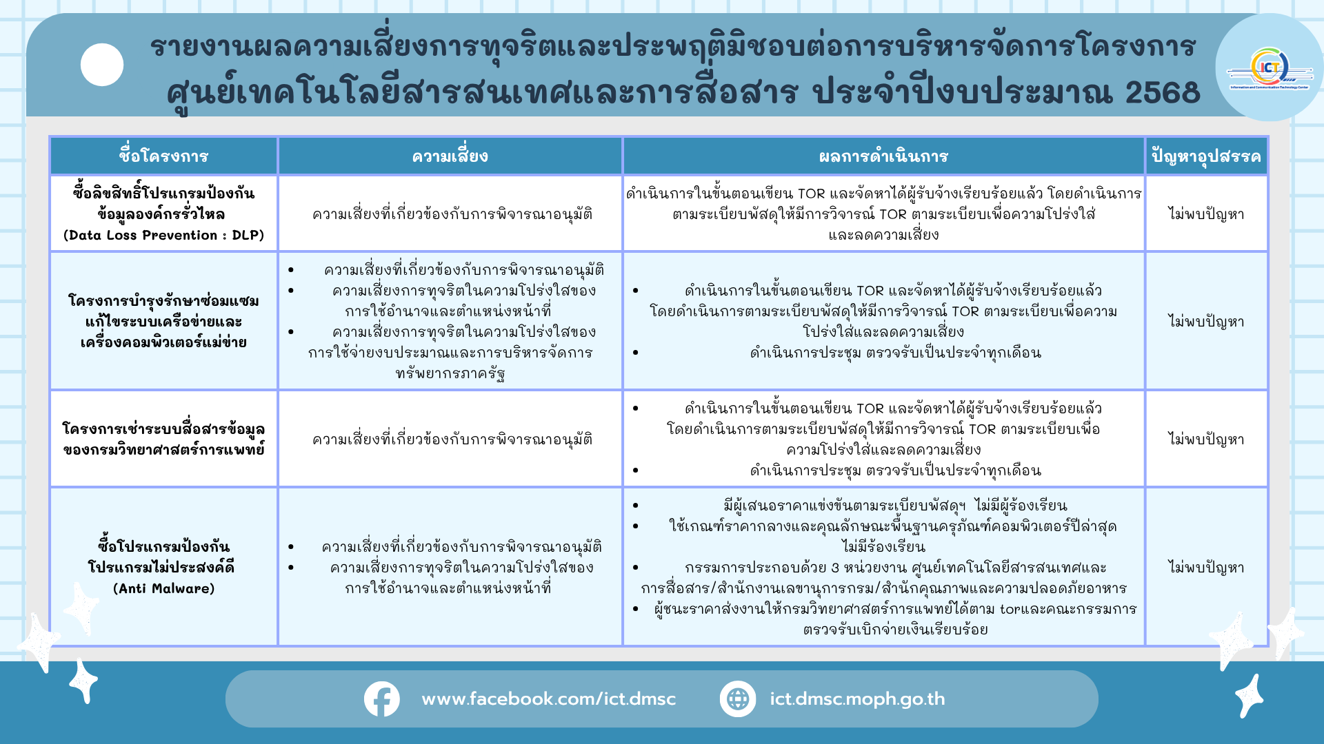 รายงานผลความเสี่ยงการทุจริตและประพฤติมิชอบต่อการบริหารจัดการโครงการ