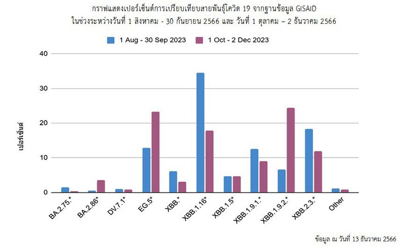 สถานการณ์โดยรวมของประเทศไทยในปัจจุบัน พบว่า สัดส่วนของสายพันธุ์ EG.5* และ XBB.1.92* มีแนวโน้มเพิ่มขึ้น ในขณะที่สัดส่วนของสายพันธุ์ XBB.1.16* กับ XBB.2.3* มีแนวโน้มลดลง เมื่อเทียบกับช่วงสองเดือนก่อนหน้า